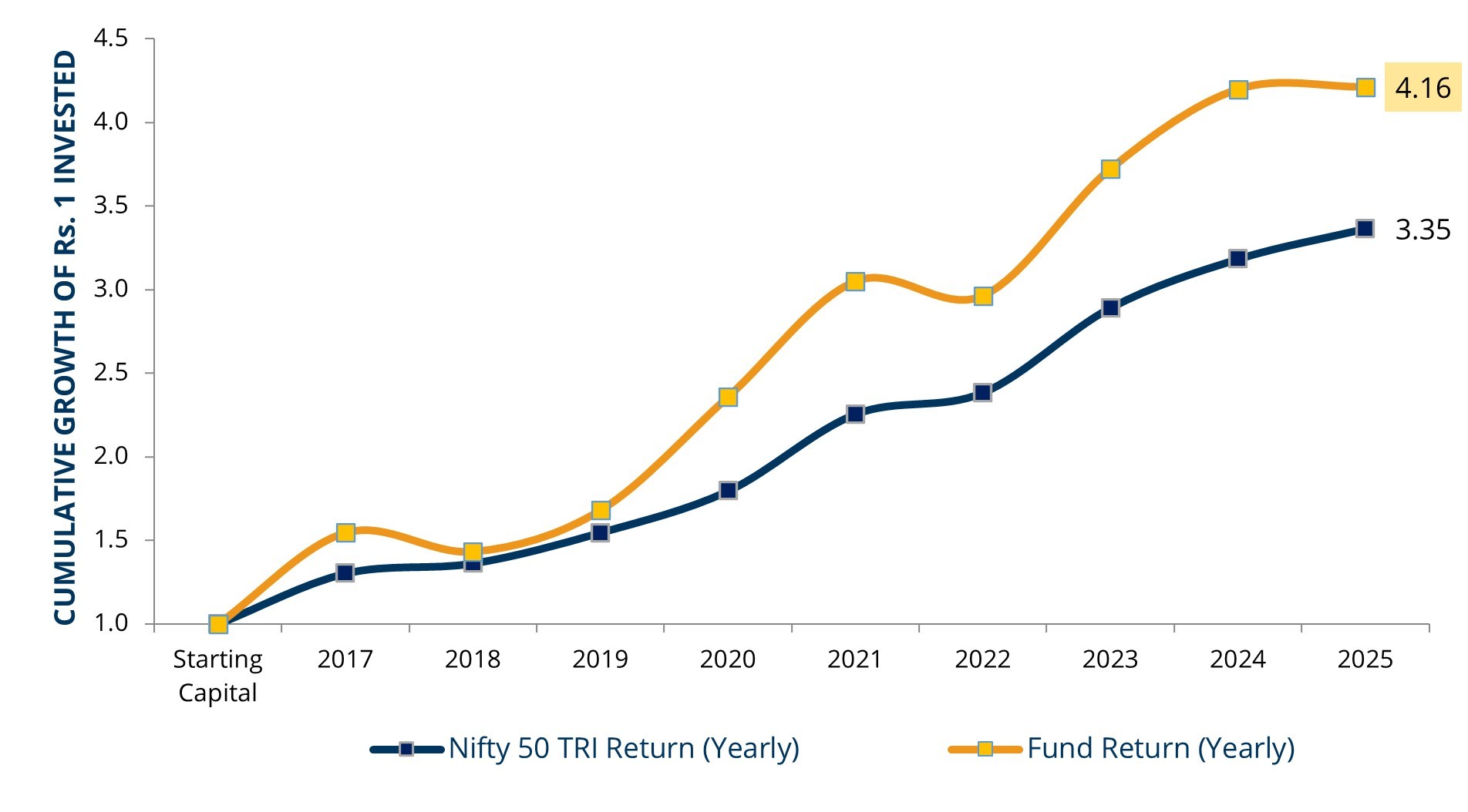Rs.1 invested in the fund in 2017 would be worth Rs. 4.16 today vs a comparable Rs. 3.35 in NIFTY